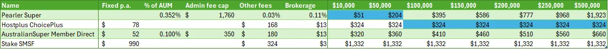 Here’s the best comparison I’ve found which looks at how they compare based on balance size including a low cost SMSF from Stake. Full credit to Reddit user ‘SwaankyKoala’ for excellent table (click to enlarge):